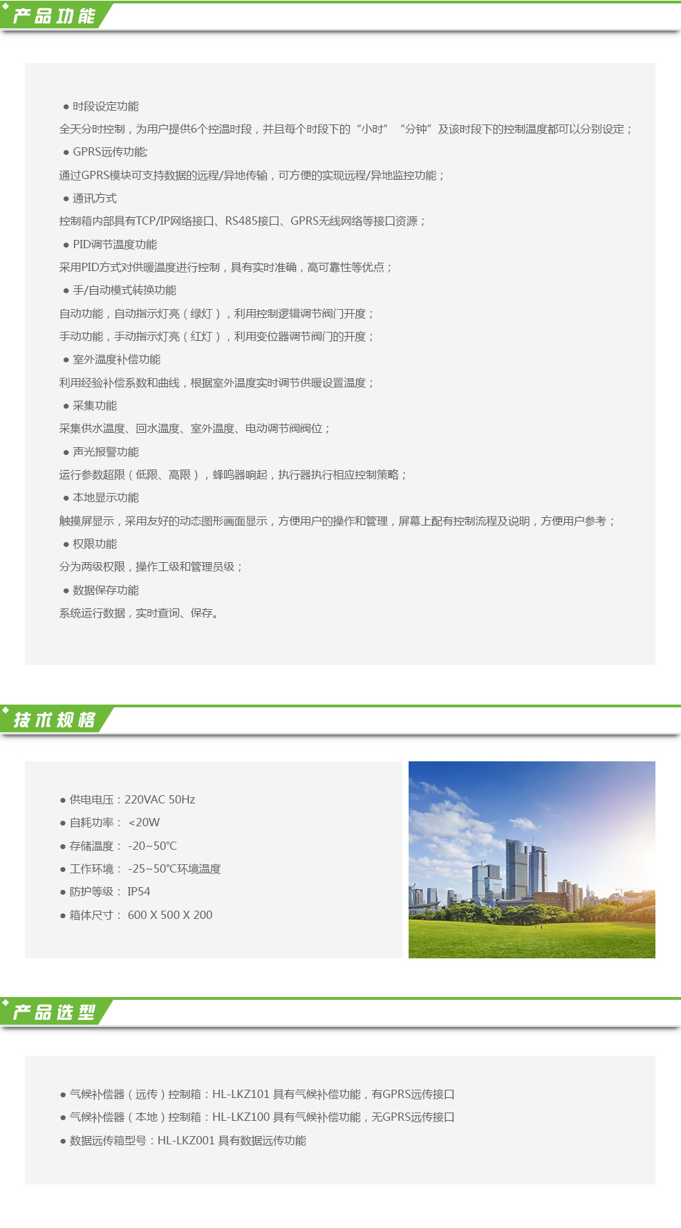 氣候補(bǔ)償器根據(jù)室外溫度變化,檢測供水溫度與設(shè)定溫度的偏差,通過PI/PID方式輸出DC0-10V信號控制閥門的開度。氣候補(bǔ)償器由于采用連續(xù)調(diào)節(jié)PI/PID控制方式,控制精度最高可達(dá)到0.5℃。即通過“量”調(diào)節(jié)控制,達(dá)到“質(zhì)”調(diào)節(jié)的目的,最大化的節(jié)約能源,克服室外環(huán)境溫度變化造成的室內(nèi)溫度波動,達(dá)到節(jié)能、舒適的目的。氣候補(bǔ)償器具備時段控制、超溫報警、遠(yuǎn)程設(shè)定、限位控制等主要功能。主要應(yīng)用于供熱系統(tǒng)及其他溫控系統(tǒng),具有高自動化、高效率、高應(yīng)用性的特點。根據(jù)系統(tǒng)的不同,節(jié)能率在5-10%之間。