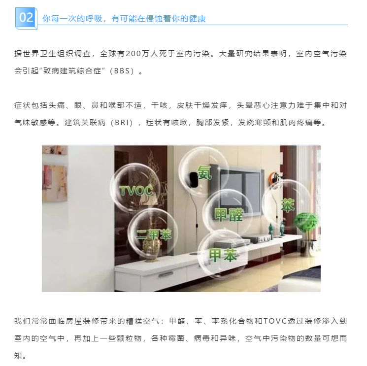 我們常常面臨房屋裝修帶來(lái)的糟糕空氣:甲醛、苯、苯系化合物和TOVC透過(guò)裝修滲入到室內(nèi)的空氣中,再加上一些顆粒物,各種霉菌、病毒和異味,空氣中污染物的數(shù)量可想而知。
