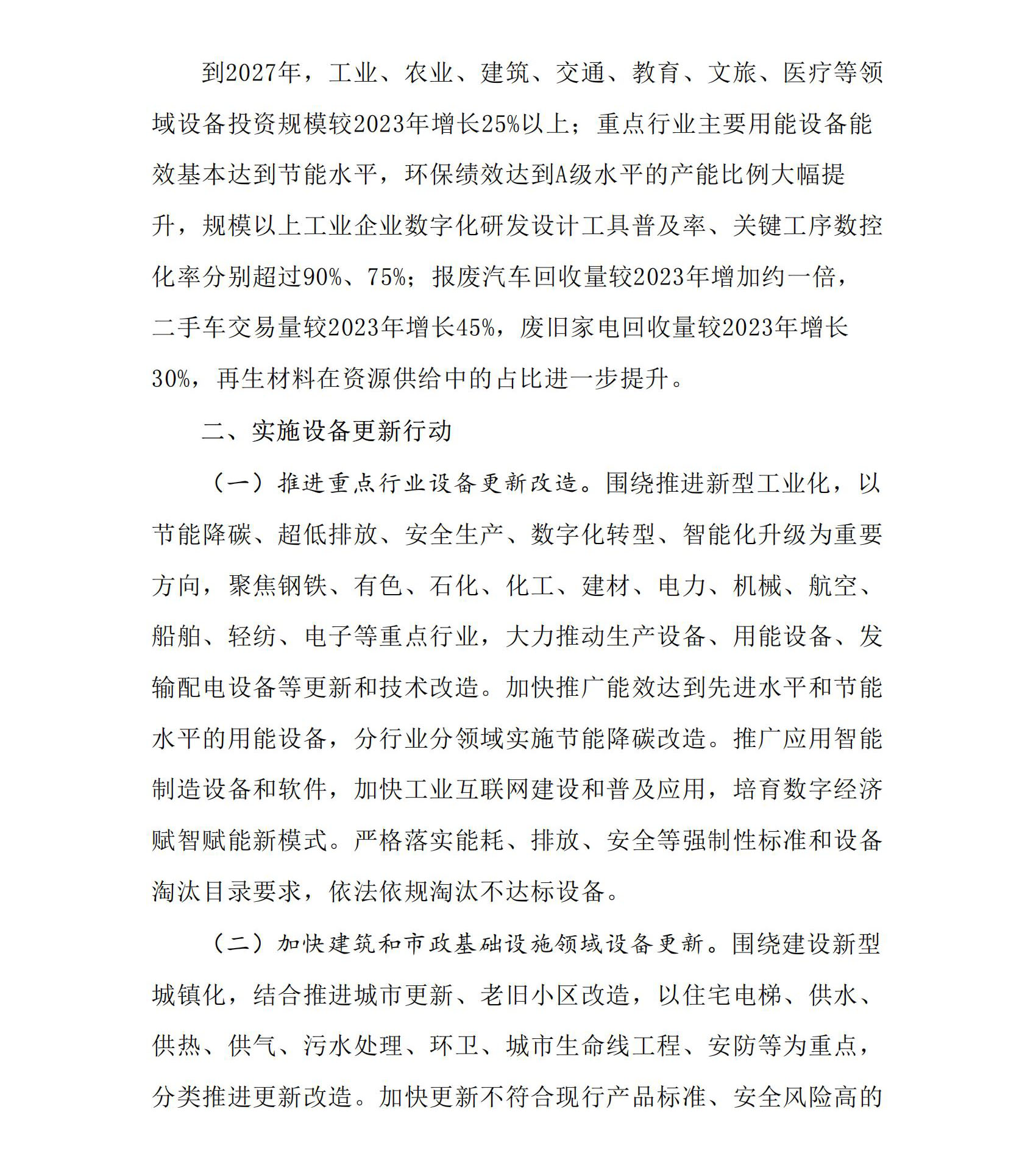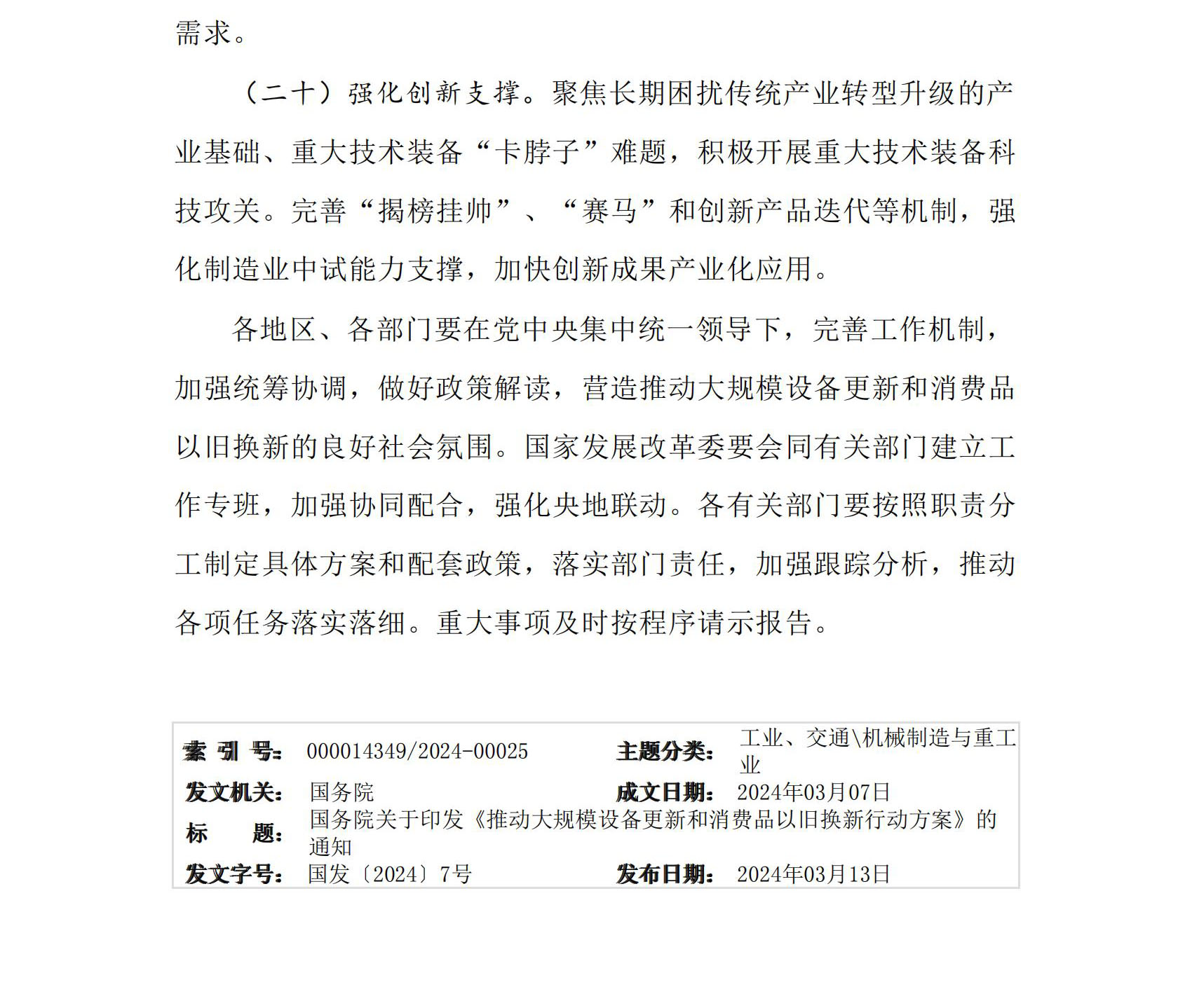 3月13日晚間,國務(wù)院正式印發(fā)《推動(dòng)大規(guī)模設(shè)備更新和消費(fèi)品以舊換新行動(dòng)方案》。