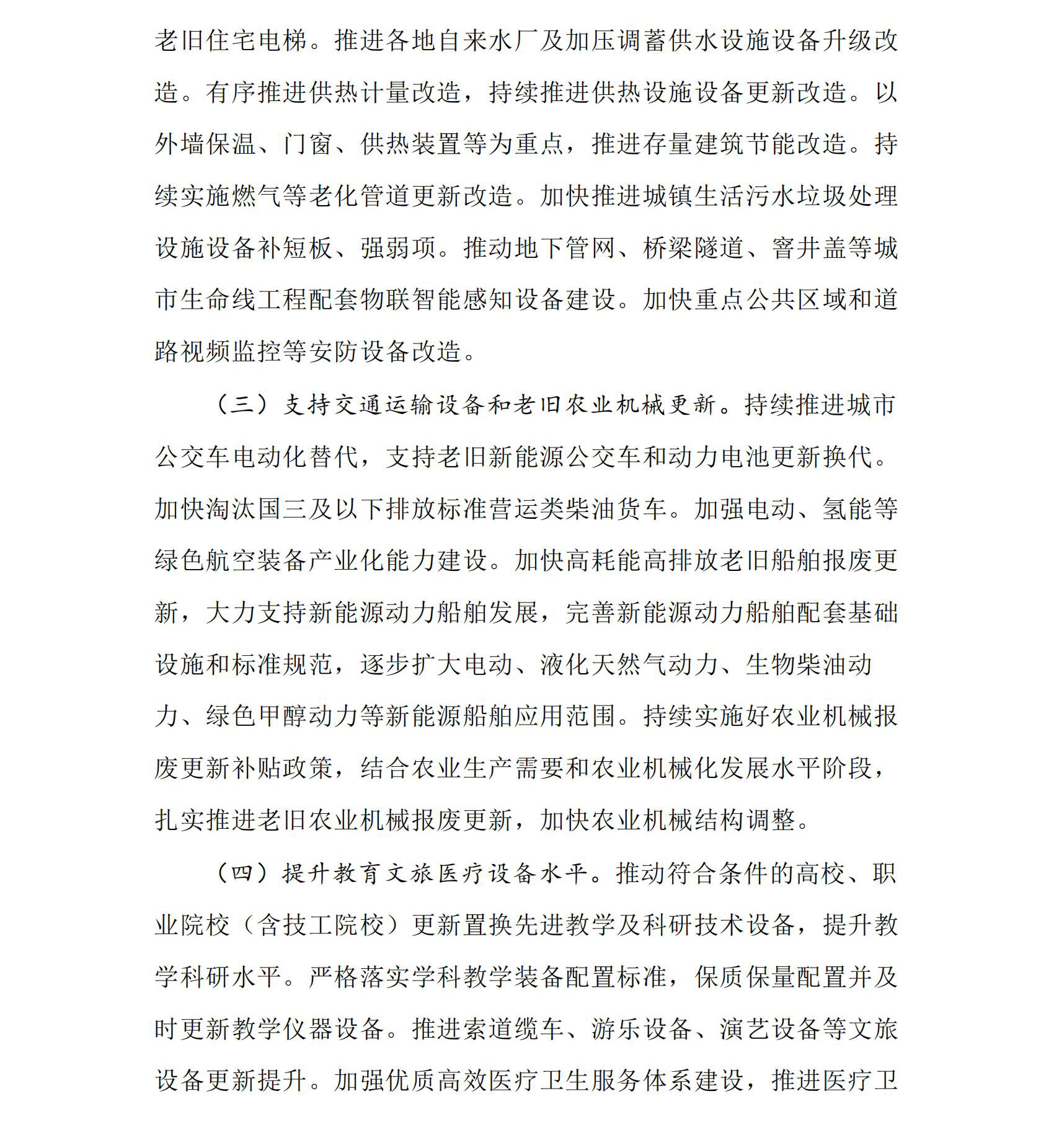 (二)加快建筑和市政基礎(chǔ)設(shè)施領(lǐng)域設(shè)備更新。圍繞建設(shè)新型城鎮(zhèn)化,結(jié)合推進(jìn)城市更新、老舊小區(qū)改造,以住宅電梯、供水、供熱、供氣、污水處理、環(huán)衛(wèi)、城市生命線工程、安防等為重點(diǎn),分類推進(jìn)更新改造。加快更新不符合現(xiàn)行產(chǎn)品標(biāo)準(zhǔn)、安全風(fēng)險(xiǎn)高的老舊住宅電梯。推進(jìn)各地自來水廠及加壓調(diào)蓄供水設(shè)施設(shè)備升級改造。有序推進(jìn)供熱計(jì)量改造,持續(xù)推進(jìn)供熱設(shè)施設(shè)備更新改造。以外墻保溫、門窗、供熱裝置等為重點(diǎn),推進(jìn)存量建筑節(jié)能改造。持續(xù)實(shí)施燃?xì)獾壤匣艿栏赂脑臁<涌焱七M(jìn)城鎮(zhèn)生活污水垃圾處理設(shè)施設(shè)備補(bǔ)短板、強(qiáng)弱項(xiàng)。推動(dòng)地下管網(wǎng)、橋梁隧道、窨井蓋等城市生命線工程配套物聯(lián)智能感知設(shè)備建設(shè)。加快重點(diǎn)公共區(qū)域和道路視頻監(jiān)控等安防設(shè)備改造。