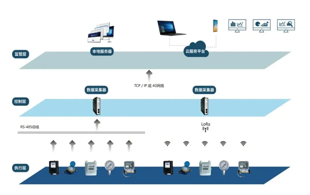 通過 RS-485 總線或 LoRa 通訊模塊,將計(jì)量表具的數(shù)據(jù)收集到智能網(wǎng)關(guān),在施工布線困難的情況下,采用 LoRa 無線通訊模塊,免去復(fù)雜的施工布線,將計(jì)量表具的數(shù)據(jù)簡單有效地傳輸?shù)街悄芫W(wǎng)關(guān)。