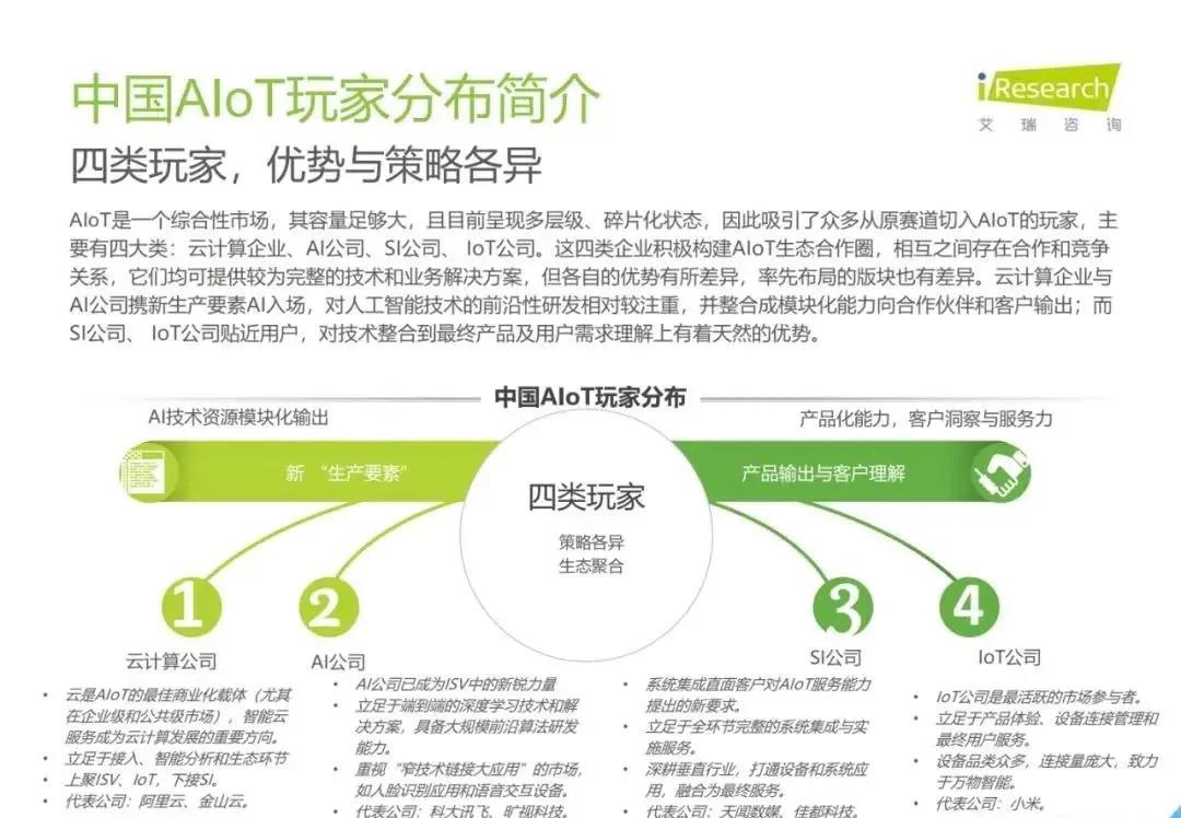 白皮書指出,AIoT是一個(gè)綜合性市場(chǎng),其容量足夠大,且目前呈現(xiàn)多層級(jí)、碎片化狀態(tài),因此吸引了眾多從原賽道切入AIoT的玩家,主要有四大類:云計(jì)算企業(yè)、AI公司、SI公司、IoT公司。艾瑞推測(cè),受益于智能家居場(chǎng)景的率先爆發(fā),2019年物聯(lián)網(wǎng)連接量將達(dá)45.7億,而后由于5G的商用,低功耗廣域物聯(lián)網(wǎng)的超廣覆蓋,中國(guó)物聯(lián)網(wǎng)連接量將增至2025年的199億。