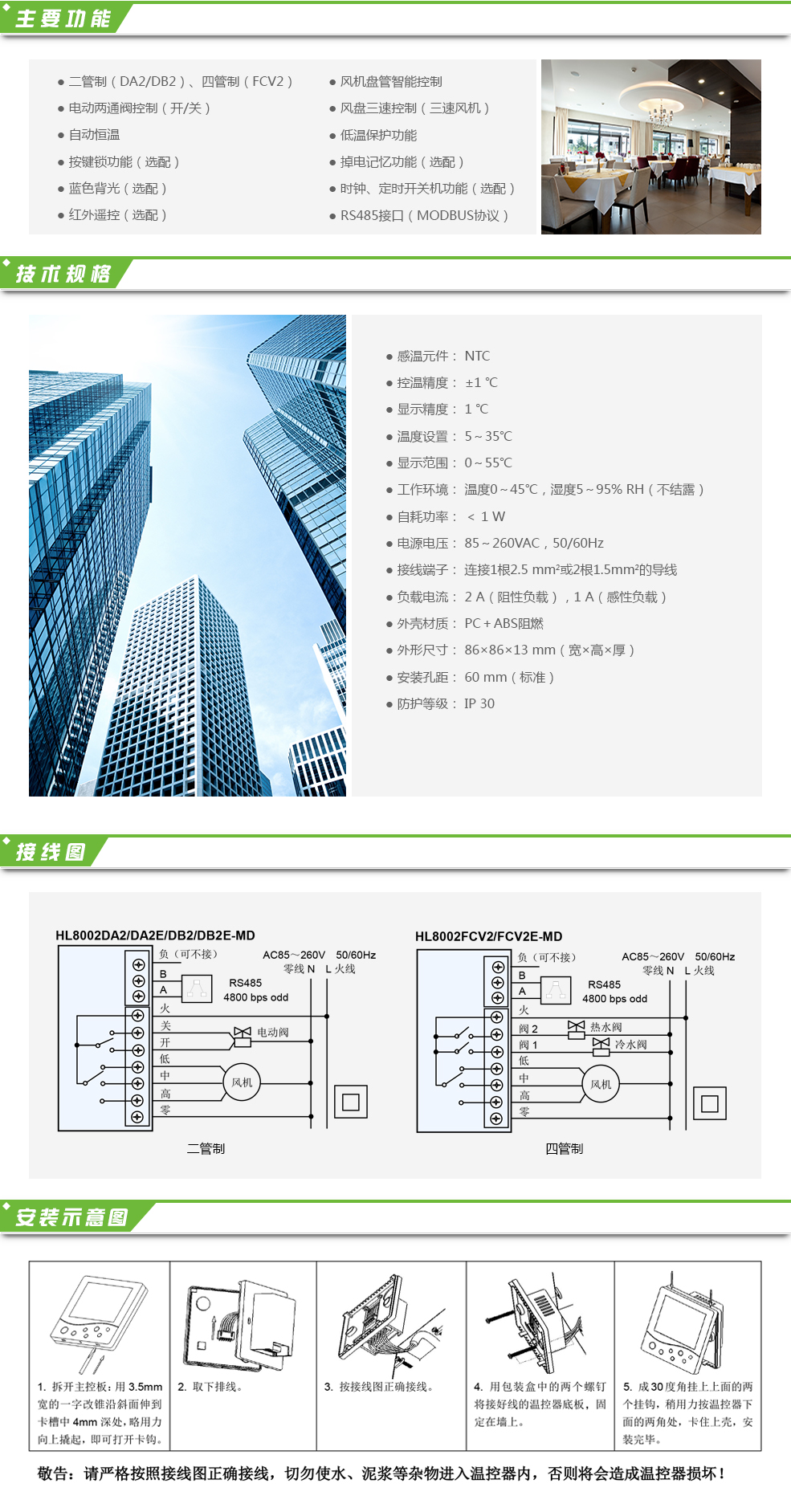 網(wǎng)絡(luò)溫控器HL8002-MD適用于中央空調(diào)風(fēng)機(jī)盤管系統(tǒng)或風(fēng)管道系統(tǒng)的室內(nèi)溫度控制,通過室內(nèi)溫度和設(shè)定溫度相比較,對(duì)空調(diào)系統(tǒng)末端的風(fēng)機(jī)盤管、電動(dòng)閥或電動(dòng)球閥進(jìn)行開啟和關(guān)閉控制達(dá)到調(diào)節(jié)室內(nèi)溫度、舒適及節(jié)能的目的,可通過網(wǎng)絡(luò)(MODBUS協(xié)議)控制溫控器的工作。