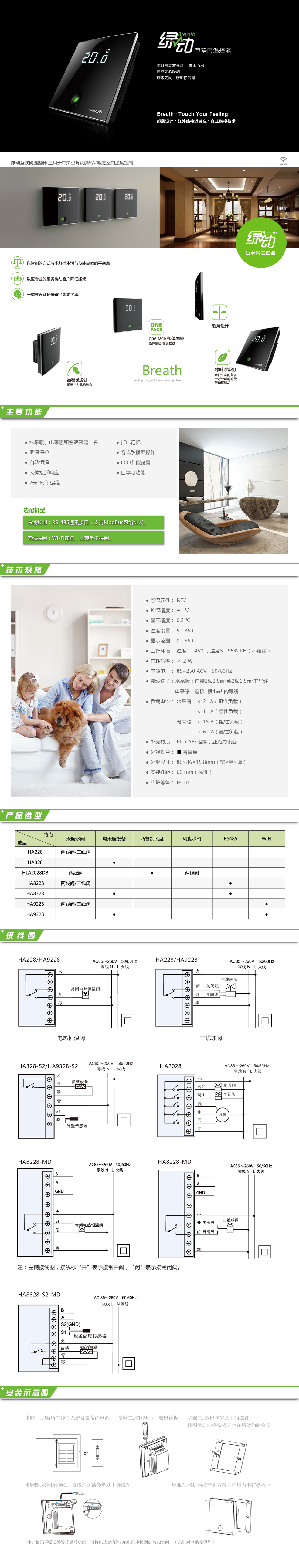 綠動采暖溫控器包括“本地控制、有線控制、無線控制”三種類型,適用于家庭地板采暖系統(tǒng)或散熱器采暖系統(tǒng)的室內(nèi)溫度控制。微弧線曲面設(shè)計彰顯柔美與力量融合。面板整體睿墨含蓄尊貴雅致。綠葉呼吸燈時尚點(diǎn)綴,如呼吸間感受生命律動象征生命萌發(fā)。