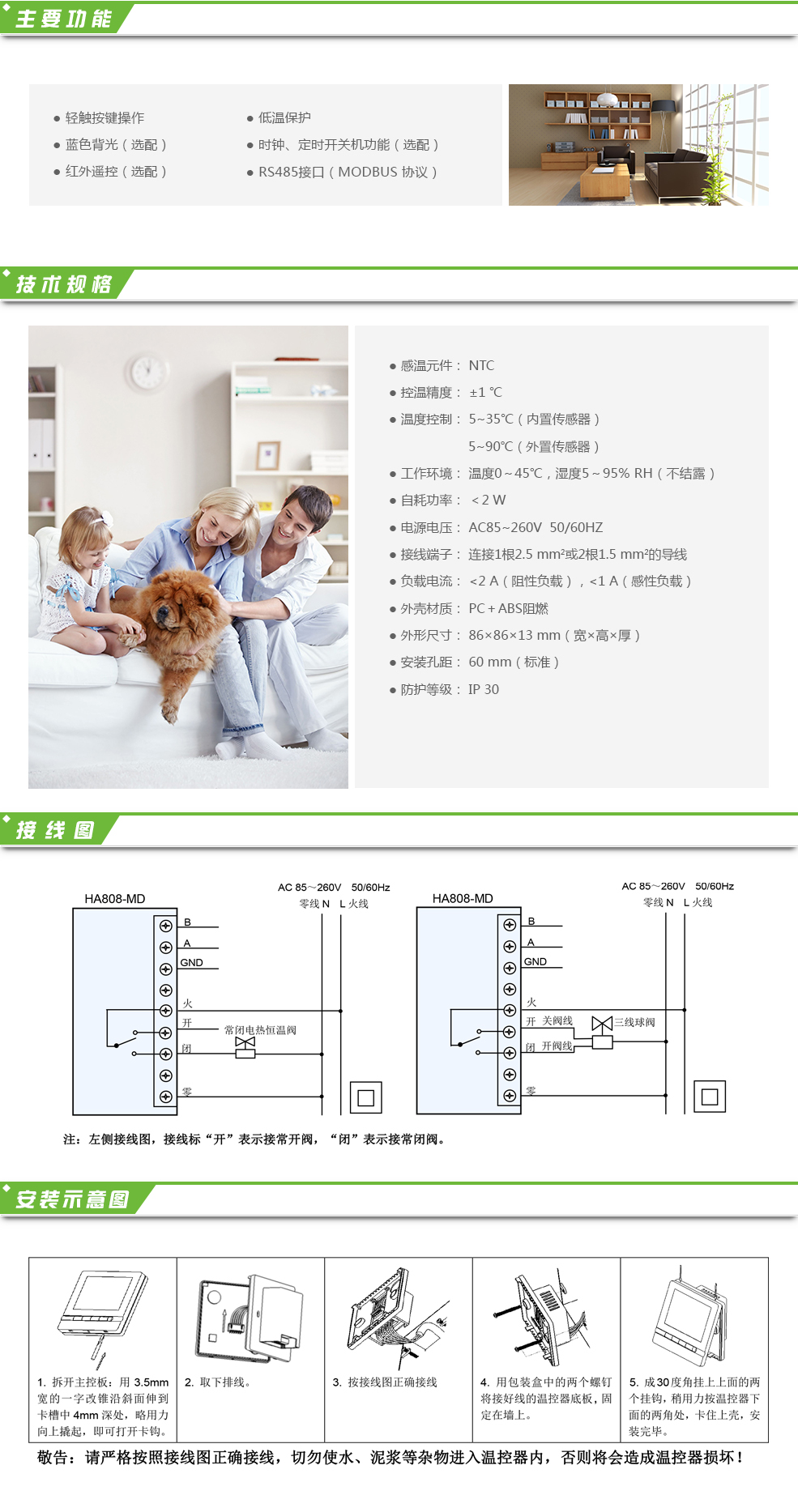 網(wǎng)絡(luò)型溫控器HA808-MD是適用于水采暖系統(tǒng)的采暖溫控器,用于家庭、辦公樓、寫(xiě)字樓、學(xué)校等場(chǎng)所。通過(guò)控制電熱閥(或球閥)的開(kāi)啟與關(guān)閉,達(dá)到調(diào)節(jié)室內(nèi)溫度的作用,同時(shí)具備低溫保護(hù)功能??赏ㄟ^(guò)網(wǎng)絡(luò)(MODBUS 協(xié)議)實(shí)現(xiàn)遠(yuǎn)程數(shù)據(jù)采集和集中控制。