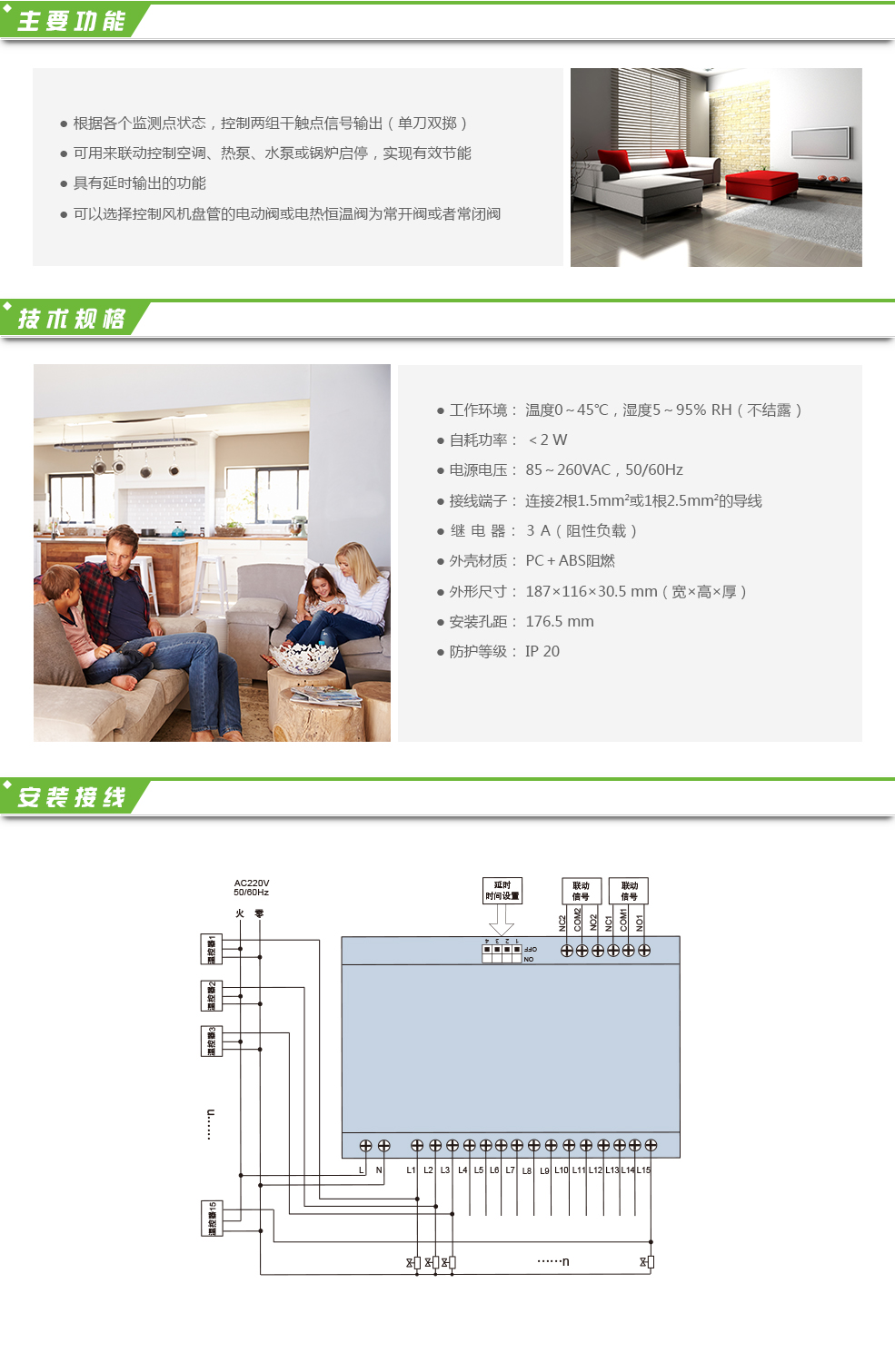 聯(lián)機(jī)控制器HL309-15,可自動(dòng)檢測(cè)各個(gè)風(fēng)機(jī)盤管或電熱恒溫閥的工作狀態(tài),根據(jù)風(fēng)機(jī)盤管或電熱恒溫閥的開關(guān),輸出干觸點(diǎn)的聯(lián)機(jī)控制信號(hào)。當(dāng)所有風(fēng)機(jī)盤管或電熱恒溫閥關(guān)閉后,輸出的干觸點(diǎn)斷開;而當(dāng)有一個(gè)或多個(gè)風(fēng)機(jī)盤管或電熱恒溫閥啟動(dòng)后,輸出的干觸點(diǎn)閉合。合理分配能源,減少能源浪費(fèi),能達(dá)到真正的“既舒適又節(jié)能”的目的。