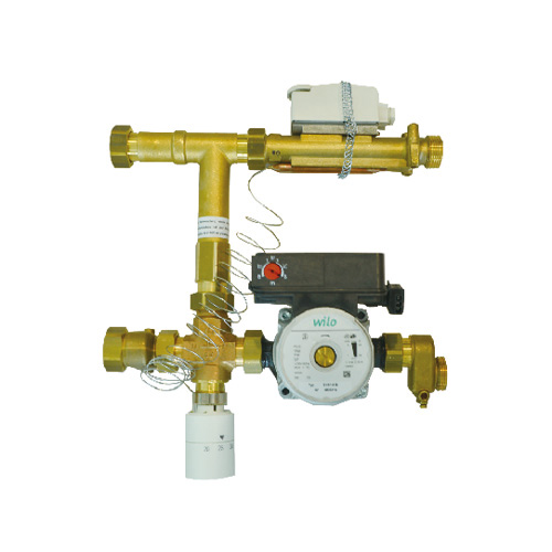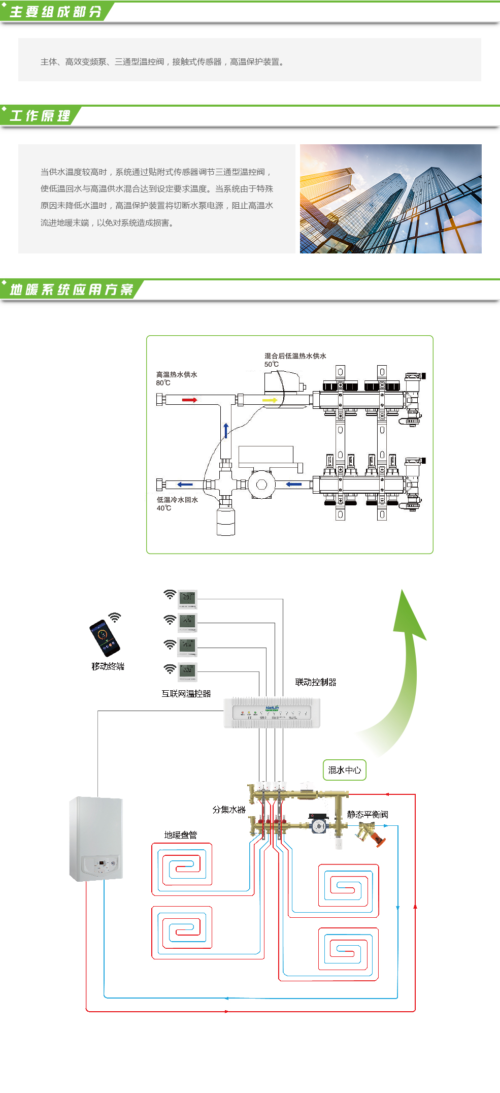 E2505型混水中心是將末端地暖高溫供水降低溫度。例如在改造項(xiàng)目中,采暖末端散熱器與地暖同時存在,熱源供水溫度較高的系統(tǒng)中,將高溫供水與低溫回水混合,通過傳感器與溫控閥調(diào)節(jié)混合比例,達(dá)到降低供水溫度目的。