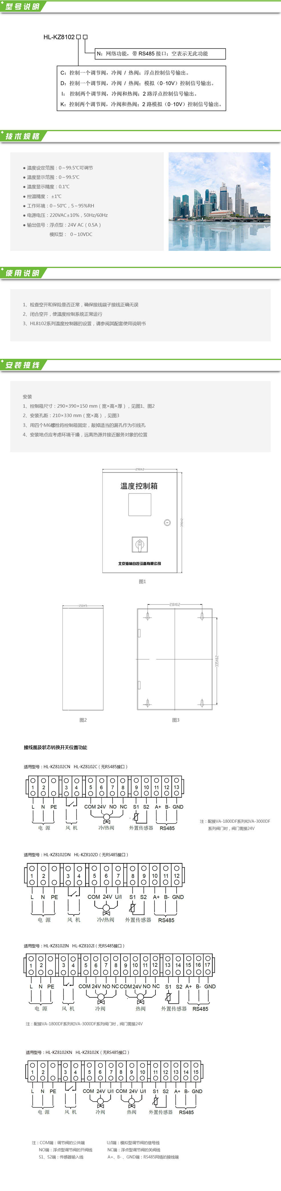 HL-KZ8102系列溫度控制箱配裝HL8102系列溫度控制器,主要應(yīng)用于水系統(tǒng)或風(fēng)系統(tǒng)的溫度控制。通過對檢測參數(shù)與溫度控制器上用戶設(shè)定的參數(shù)相比較、判斷,控制電動調(diào)節(jié)閥的開度,根據(jù)溫差控制風(fēng)機(jī)的工作狀態(tài)(起動與停止),從而達(dá)到恒定水溫或室溫的目的。